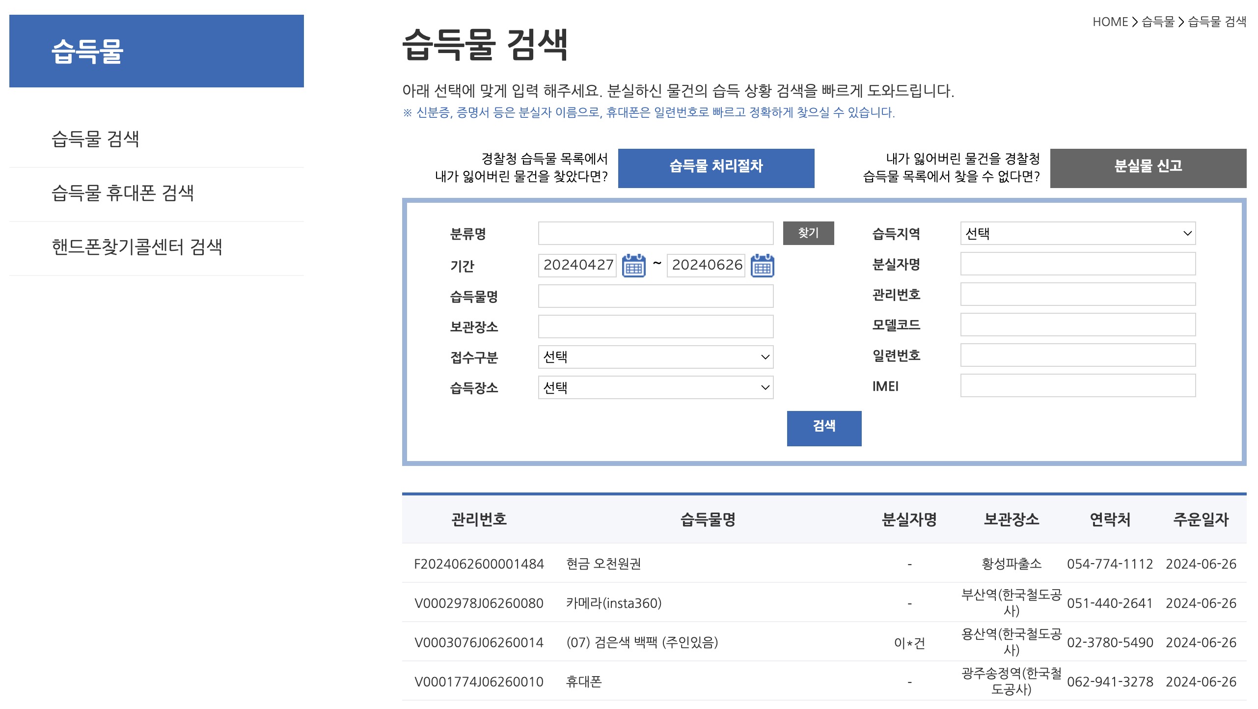 홈페이지 화면을 보시면 "분실물 검색" 부터 "습득물 검색(휴대폰)"까지 가능하기 때문에 쉽게 찾아볼 수 있고, 운이 좋다면 빠르게 분실된 소지품을 찾을 수 있겠습니다.