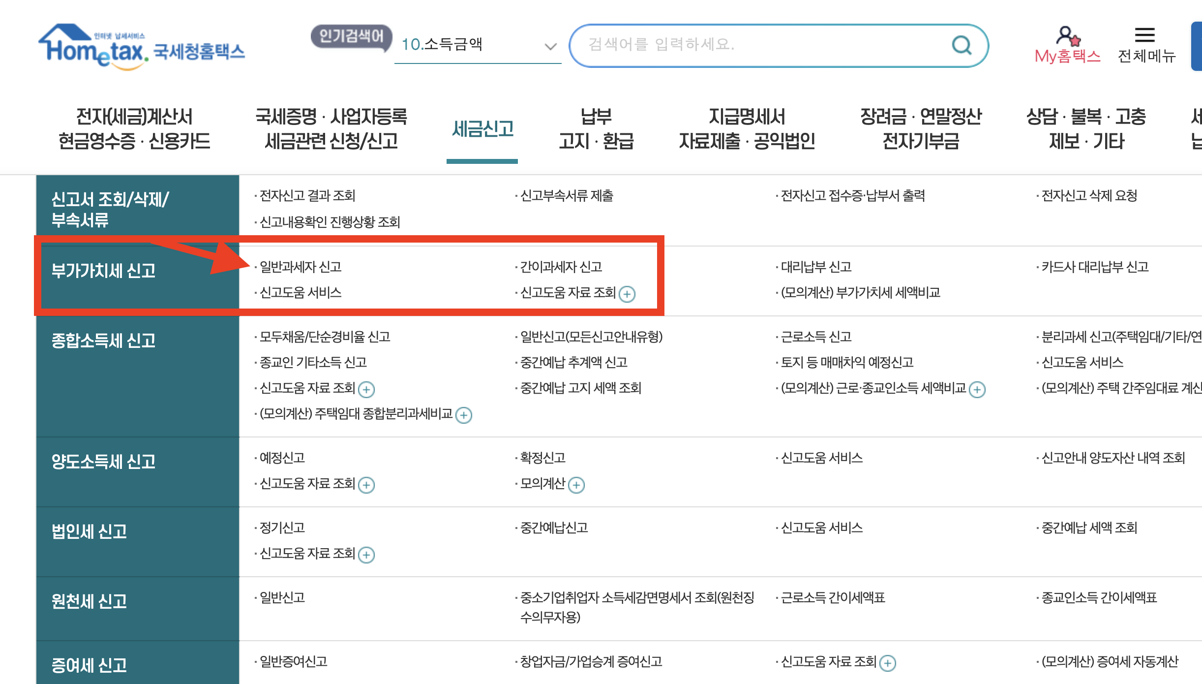 홈페이지 화면에서 "세금신고" 카테고리에 들어가서 각자 사업자 유형에 맞게 "일반과세자" "간이과세자"로 나눠서