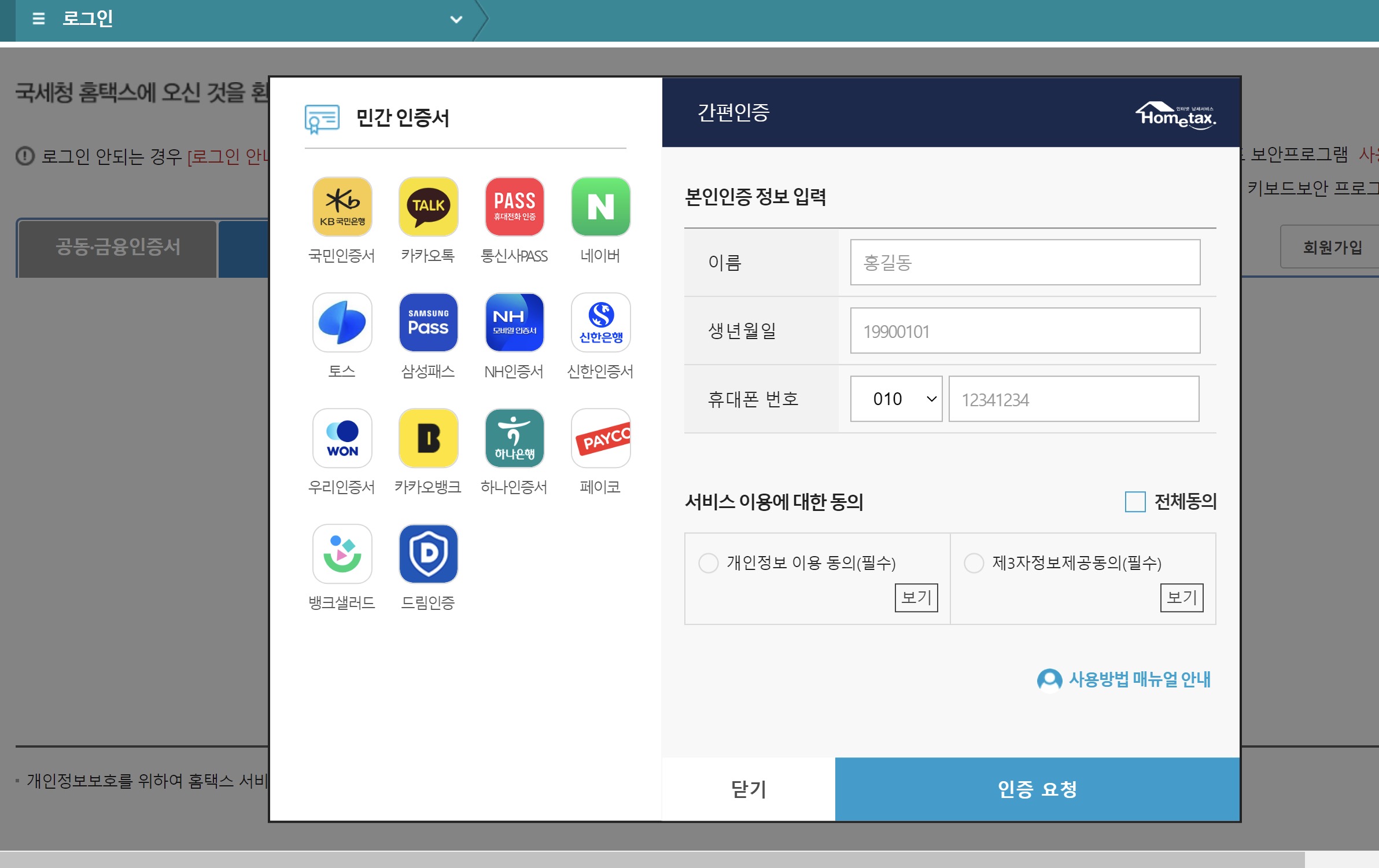 아래와 같이 홈텍스 로그인은 간편인증으로도 개인 로그인 가능하며, 사업자로 전환도 할 수 있습니다.